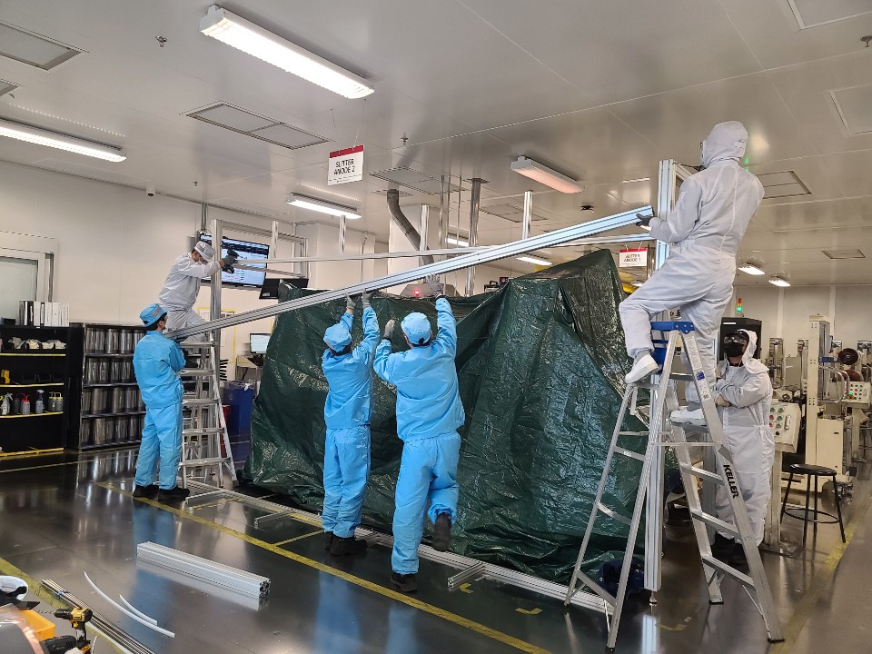 상부에 캡 형식으로 FFU를 추가 설치하는 방식으로 기계장비 옆 바닥에서 프레임 제작 조립 후 장비 상부 쪽에 타공 하는 방식으로 진행하였습니다.