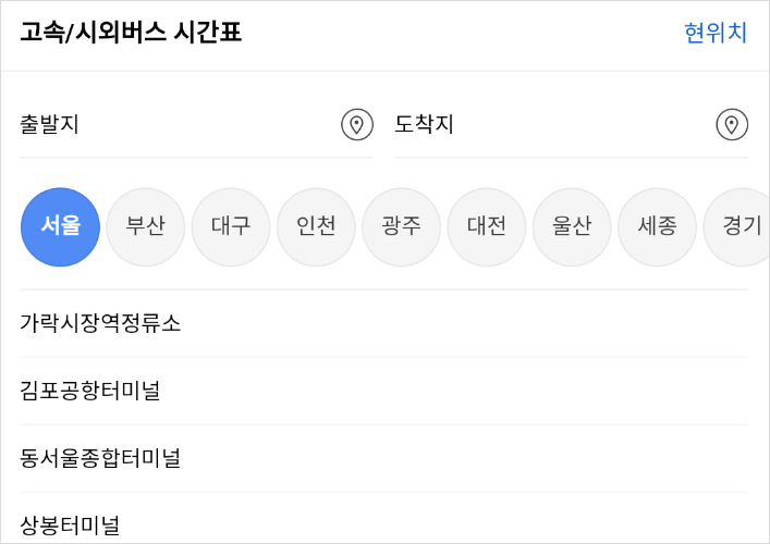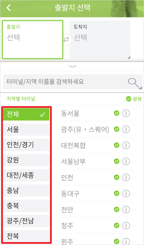 운행정보 조회시, 출발지와 도착지는 직접 입력도 가능하고 돋보기를 눌러 출발/도착 터미널을 지역별로 선택할 수도 있습니다.