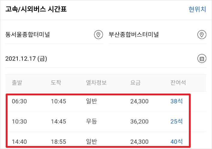 4. 출발지와 도착지 터미널까지 선택하고 조회하면 조회한 운행편의 출발시간, 차편 정보, 요금정보, 잔여좌석이 표시됩니다.