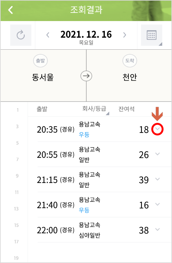 2. 출발지와 도착지 그리고 출발 날짜를 선택하면 아래 출발시간, 도착시간, 열차정보, 요금, 잔여석까지 간편하게 표시됩니다.