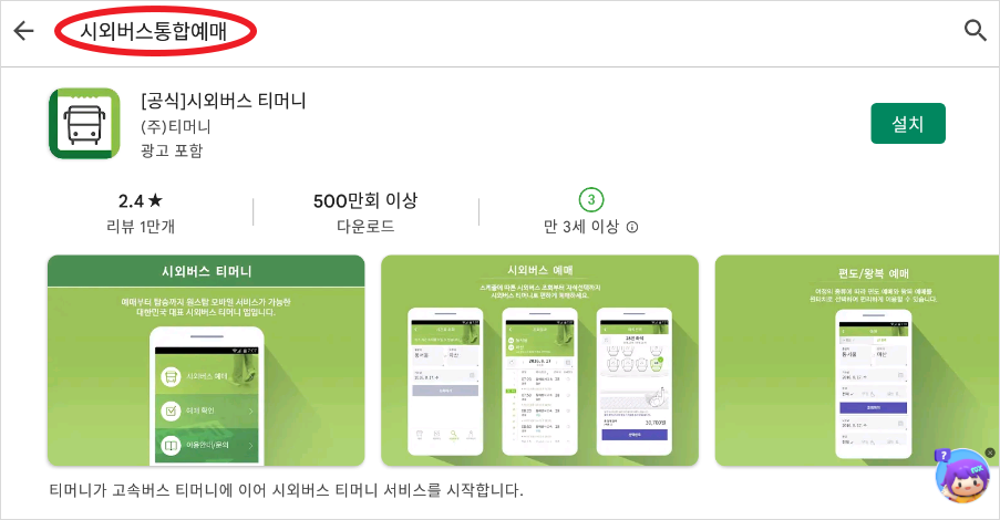 1. 스마트폰으로 플레이스토어나 애플스토어에서 "시외버스 통합예매" 검색 후 앱을 다운로드하여 설치해 줍니다.