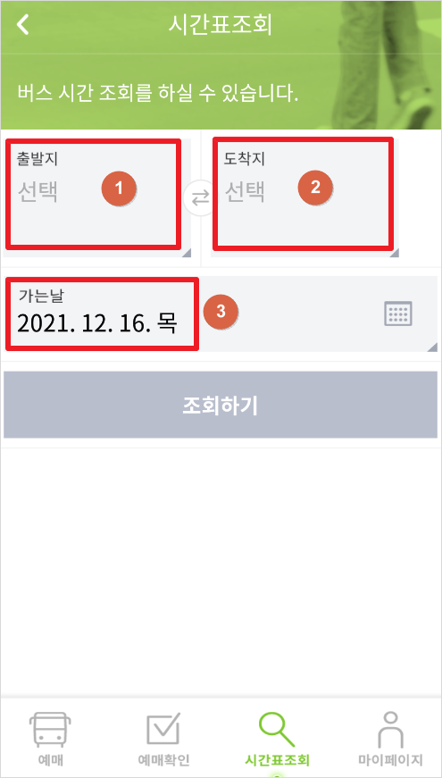 3. ①출발지와 ②도착지를 선택하고 ③출발 날짜까지 선택 후 조회하기 버튼을 눌러줍니다.