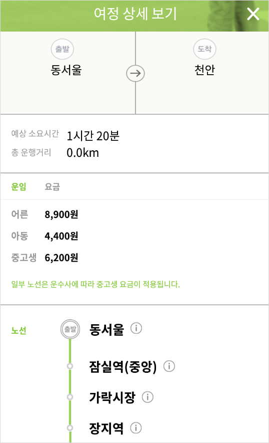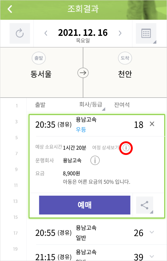 4. 조회 결과에서 잔여석 옆에 √표시를 누르면 해당 시간 차편의 예상 소요시간과 요금이 표시되고 다시 여정 상세보기 ⓘ를 누르면 요금 상세내역과 자세한 노선이 표시됩니다.