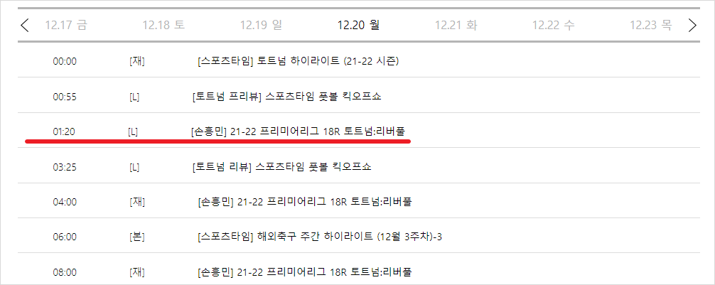 20일 진행되는 토트넘과 리버풀 경기를 tv로 시청하기 위해서는 스포츠 전문채널인 '스포티비'를 통해서 01:20부터 실시간 라이브 중계방송을 시청하실 수 있습니다.