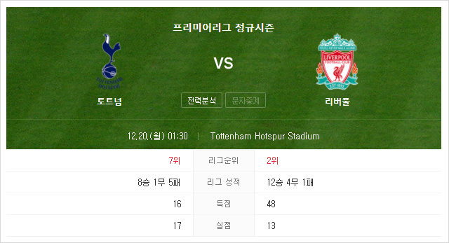 손흥민 선수의 경우, 훈련장에 모습을 드러낸 만큼 이번 리버풀과의 경기에서 선발이 아니더라도 12월의 빠듯한 일정을 소화해야 하는 토트넘으로써는 경기력 유지와 컨디션 조절을 위해 경기 선발이나 교체로 손흥민 선수 투입이 예상됩니다.
