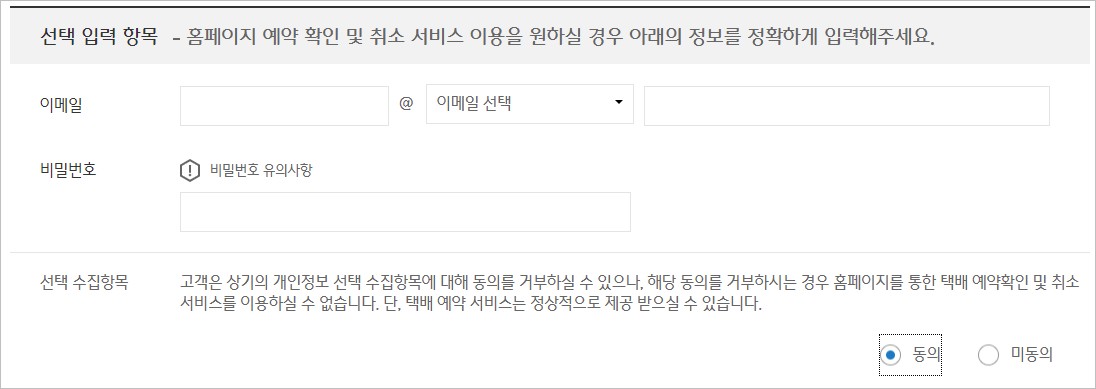 단, 미동의 하실 경우 택배 예약 확인 및 취소 서비스를 이용할 수 없으며 예약 서비스는 정상적으로 제공받을 수 있습니다. 이 경우 택배기사님이 방문하시기 전에 미리 유선으로 취소 요청을 해야 하기 때문에 입력하시는 게 편리합니다.