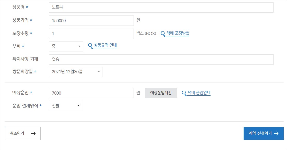 - 취급주의 상품은 보호재 포장을 필요로 하며 신청 상품에 따라 예약 취소할 수 있습니다.