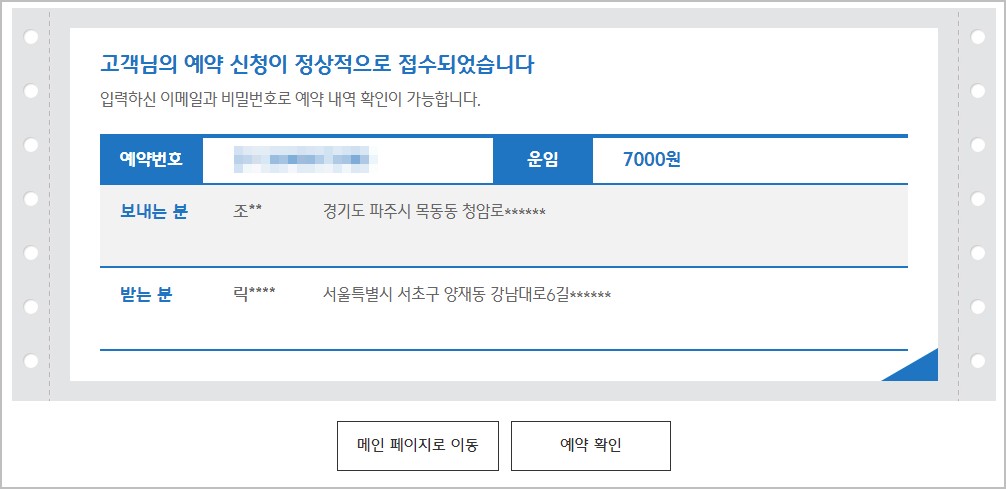 6. 모든 정보를 입력하고, 예약 신청하기 버튼을 누르면 예약번호와 함께 보내는 분 정보, 받는 분 정보 등이 표시된 예약 접수증이 출력되고 예약접수가 완료됩니다.
