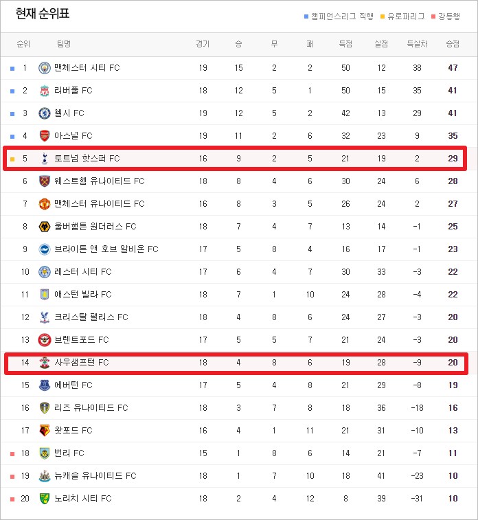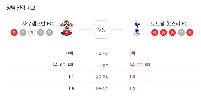 프리미어리그 순위를 살펴보면 토트넘은 코로나19 집단 감염에 따른 리그 경기 연기로 인해 다른 팀들에 비해 2~3경기를 덜 치른 상황에서 9승 2무 5패 승점 29점으로 리그 5위를 달라고 있으며, 리그 4위까지 주워지는 챔피언스리그 직행 티켓을 목전에 두고 있는 상황입니다. 반면 사우스햄튼은 리그 4승 8무 6패 승점 20점으로 리그 14위를 달라고 있습니다.