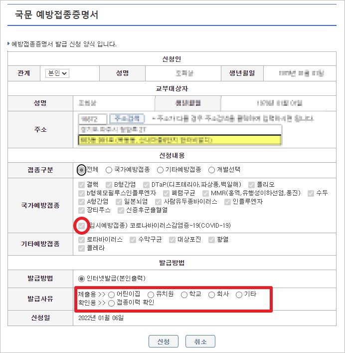 6. 국문 예방접종증명서가 신청 화면에서 주소지 확인과 발급을 원하는 예방접종 종류를 선택합니다.