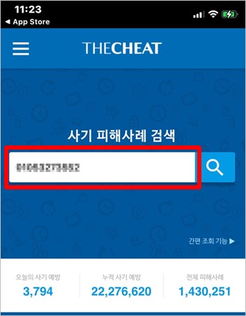 2. 사기피해사례 검색란에 조회할 전화번호나 계좌번호를 입력하고 돋보기(검색) 메뉴를 눌러줍니다.