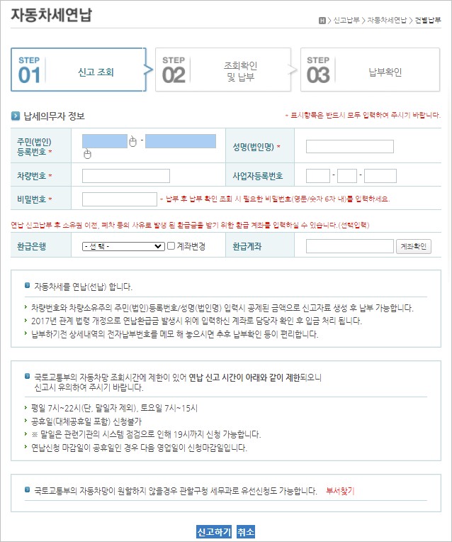 - 비회원 : 우측 상단 [전체메뉴] -> [부가서비스] -> [자동차세 연납 신청] -> [비회원 신고조회] -> '신고자 주민/법인번호' 와 '차량번호' 입력 후 [검색]