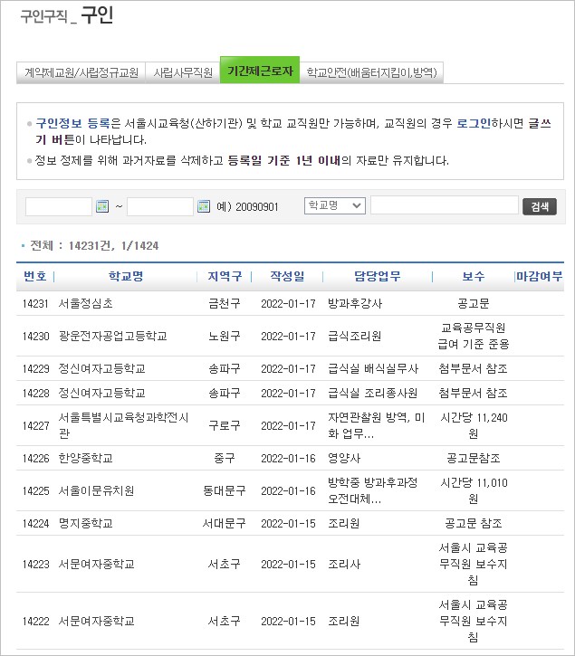 5. 그밖에도 비정규직으로 채용하고 있는 급식조리원, 시설관리자 같은 기간제 근로자나 학생들의 안전을 책임지는 학교안전(배움터지킴이, 방역) 인력 구인 정보를 확인할 수 있습니다.