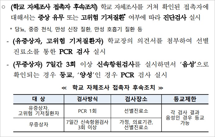 접촉자 중 유증상자나 고위험 기저질환자는 곧바로 선별진료소에서 PCR(유전자증폭) 검사를 받을 수 있다. PCR 검사에서 음성인 경우 등교가 가능하다. 접촉자 중 무증상자는 집에서 7일간 이틀 간격으로 3회 이상 신속항원검사를 실시하면서 등교한다. 각 검사 결과 음성인 경우 다음 검사 때까지 계속 등교할 수 있다.