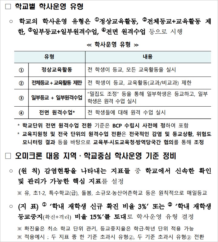 학사 운영 유형을 정상교육활동, 전체등교+교과활동 제한, 일부등교(일부원격)수업, 전면 원격수업의 4단계로 하고, 어떤 유형으로 운영할지는 지역과 학교에서 정하도록 한다. 구체적인 운영유형을 정할 때는 '학내 재학생 신규 확진 비율 3%' 또는 '학내 재학생 등교중지(확진+격리) 비율 15%'를 핵심 지표로 한다. 이 기준을 바탕으로 지역·학교에서 자율적으로 가감해 정한다.