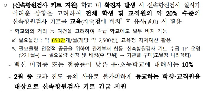 접촉자 중 무증상자는 학교에서 귀가 시 신속항원검사 키트를 받아 집에서 검사하면 됩니다. 이를 위해 각 교육청 예산으로 전체 학생 및 교직원의 약 20% 수준(한 달에 650만 개)의 신속항원검사 키트를 구비합니다. 추가 감염 방지를 위해 학교에서 바로 키트 검사를 실시하지 않습니다.