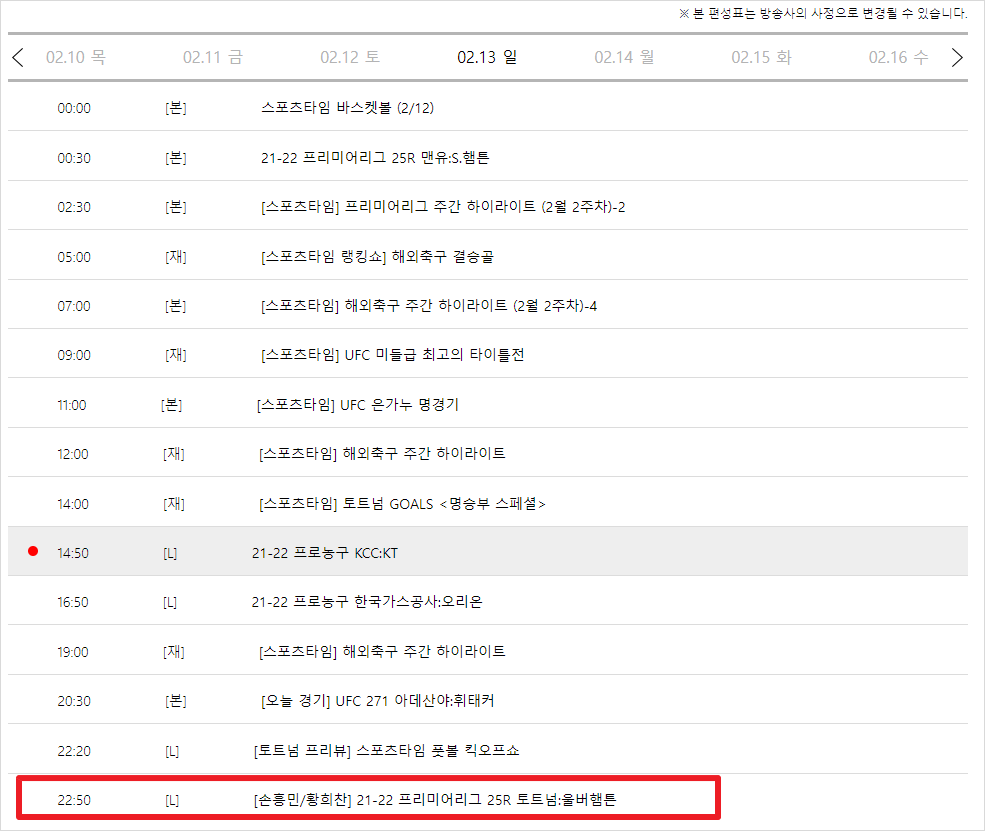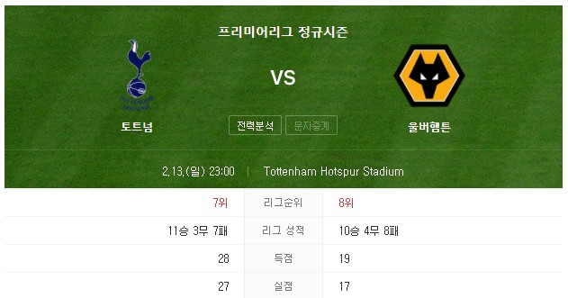 - 02/13 23:00 토트넘 vs 울버햄튼 프리미어리그