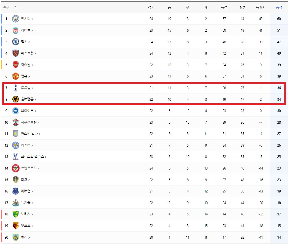토트넘은 21경기를 치른 현재 11승 3무 7패 승점 36점으로 리그 7위를 달리고 있는데 상위권 팀들에 비해 2~3경기를 덜 치른 상태이기 때문에 남은 경기 결과에 따라 상위권 도약도 가능한 상황입니다.
