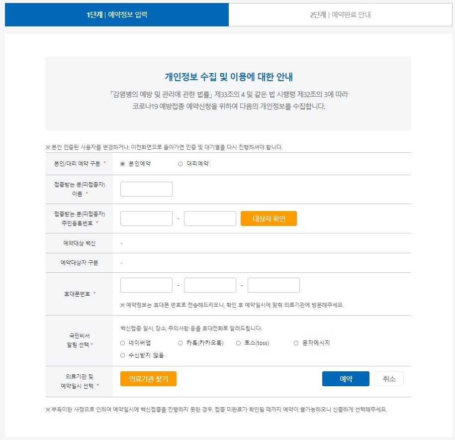 대리인으로 예약할 경우 부모님의 주민등록번호가 필요하며, 예방접종 날짜, 시간, 원하는 병원을 선택하셔서 예약을 하시면 됩니다. 예약이 완료되면 질병관리청의 확인 메시지를 받게 됩니다.