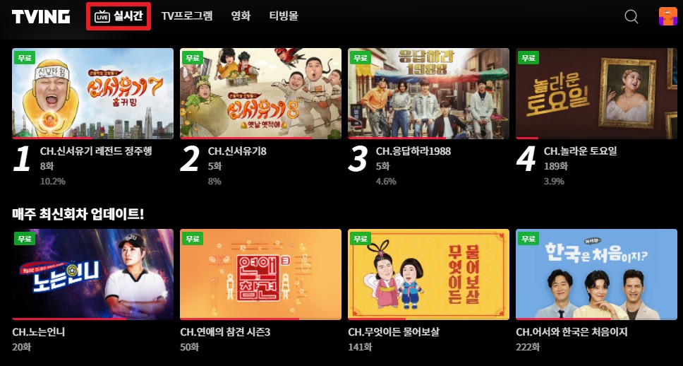 이후 상단에 실시간 메뉴를 클릭하고 [무료] 표시가 된 영상을 시청하시면 됩니다.