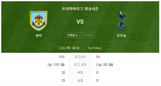 번리(19위) vs 토트넘(8위)