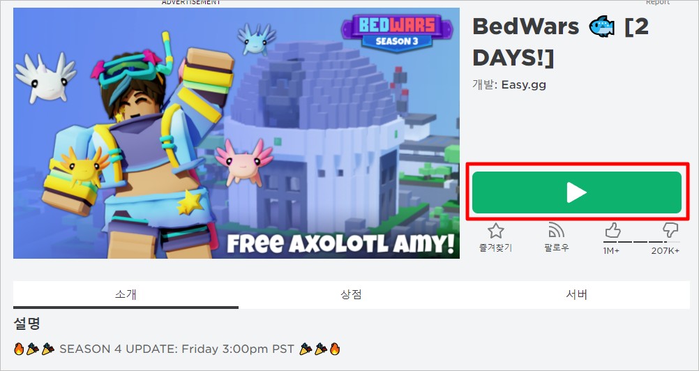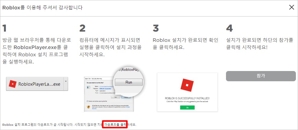 선택한 게임을 처음 플레이 하신다면 위와 같이 Roblox 다운로드 및 설치 버튼을 눌러주면 간단한 설치 방법이 안내되는데 이후 하단에 다운로드 클릭 버튼을 눌러주면 선택한 로블록스 게임이 PC에 자동으로 설치됩니다.
