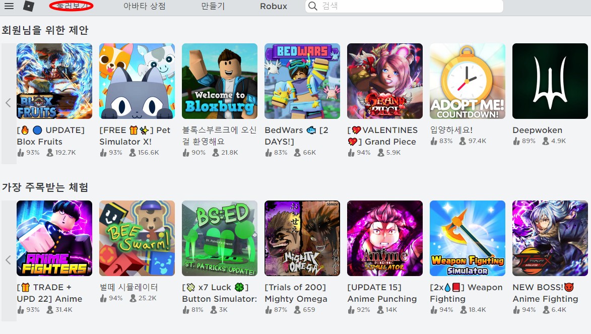 로블록스에서는 사용자가 직접 제작한 수많은 게임들을 즐길 수 있는데 좌측 상단에 [둘러보기]를 클릭해서 인기, 최고 평점, 선호도 높은 게임 등 원하는 게임을 선택해서 플레이할 수 있습니다. 만약 선택 장애가 있다면 인기 게임이나 선호도 높은 게임을 선택하면 좋겠죠?