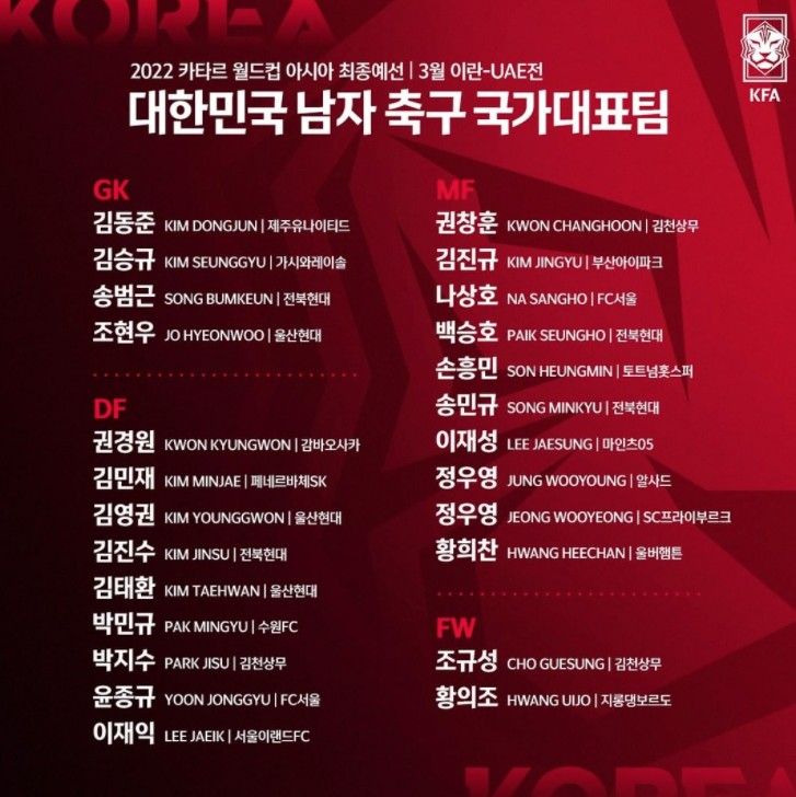 파울로 벤투 감독은 14일 대표팀 소집 명단을 발표하였는데 손흥민, 황희찬, 김민재 등 유럽파 주축 선수 대부분 소집 명단에 포함되었고 코로나19 확진 판정으로 소속팀 경기에 결장한 정우영 등도 이번 국가대표팀 명단에 이름을 올렸습니다. 한편 기대를 모았던 전북의 미드필더 백승호는 코로나19 양성 판정을 받아 울산의 원두재가 대체 발탁되었고 수원FC 수비스 박민규 선수는 생애 처음으로 대표팀에 합류하였습니다.