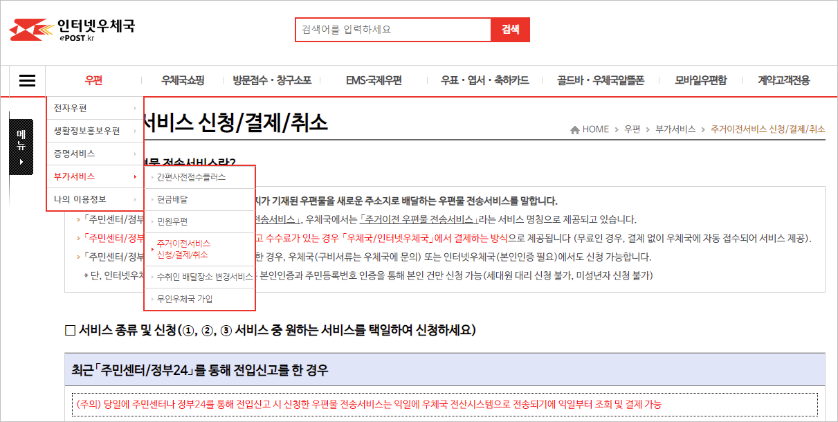 [우편] ▶ [부가서비스] ▶ [주거이전서비스 신청/결재/취소]