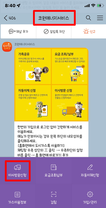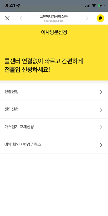 카카오톡 친구탭에서 "코원에너지서비스"를 검색한 후 이사 방문 신청을 통해 전입/전출 신청을 통해 도시가스 신청과 취소 등을 간편하게 신청 처리할 수 있습니다. 단 최소 3일 전에 예약 신청을 해야만 이용이 가능하니 당일보다는 이사날이 확정되면 여유 있게 신청해서 이용하시는게 좋습니다.