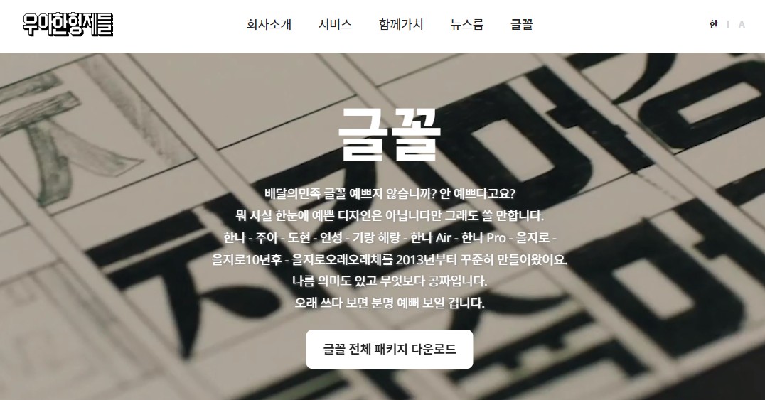 꾸준하게 인기를 얻고 있는 서체 중 하나로 일반 기업에서 옥외 광고 및 다양한 상품 브로셔 서체로 활용도가 매우 높은 폰트입니다. 개인이나 기업에서 사업적인 목적으로 사용이 가능하고 한나체, 주아체, 도현체, 연성체, 기랑해랑체, 한나체 Air, 한나체 Pro, 을지로체 등 다양한 폰트를 제공하고 있기 때문에 디자인에 맞춰 사용하기 좋은 무료 폰트입니다.