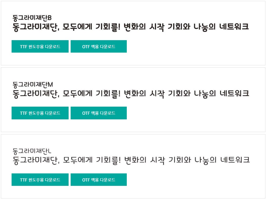 동그라미재단 창립 5주년을 맞이해서 재단의 공유와 나눔 정신을 담아 만든 폰트로 곡선의 획 형태를 표현해 부드럽고 따뜻한 감성을 담아낸 서체로 밝고 활기찬 에너지를 느낄 수 있는 동그라미 서체는 동그라미재단 B, 동그라미재단 M, 동그라미재단 L 3종 무료 폰트를 제공합니다.