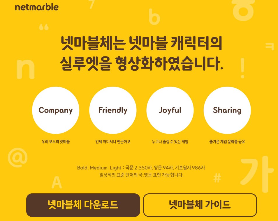 넷마블 기업 아이덴티티의 시각적인 활용의 도구로 개발된 디자인 서체로 기본 Bold, Medium, Light 3종의 폰트로 구성되어 있습니다. 넷마블체의 특징은 일반적인 산 세리프 계열의 고딕체와 유사한 구조를 가지고 있어서 가독성이 뛰어난 특징을 가지고 있습니다.