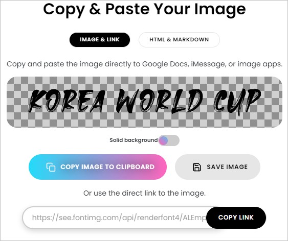 또 하나 부가적인 기능으로 미리보기 한 폰트를 바탕화면이 제거된 png 파일 형태로 바로 다운로드할 수 있도록 제공하고 있습니다.