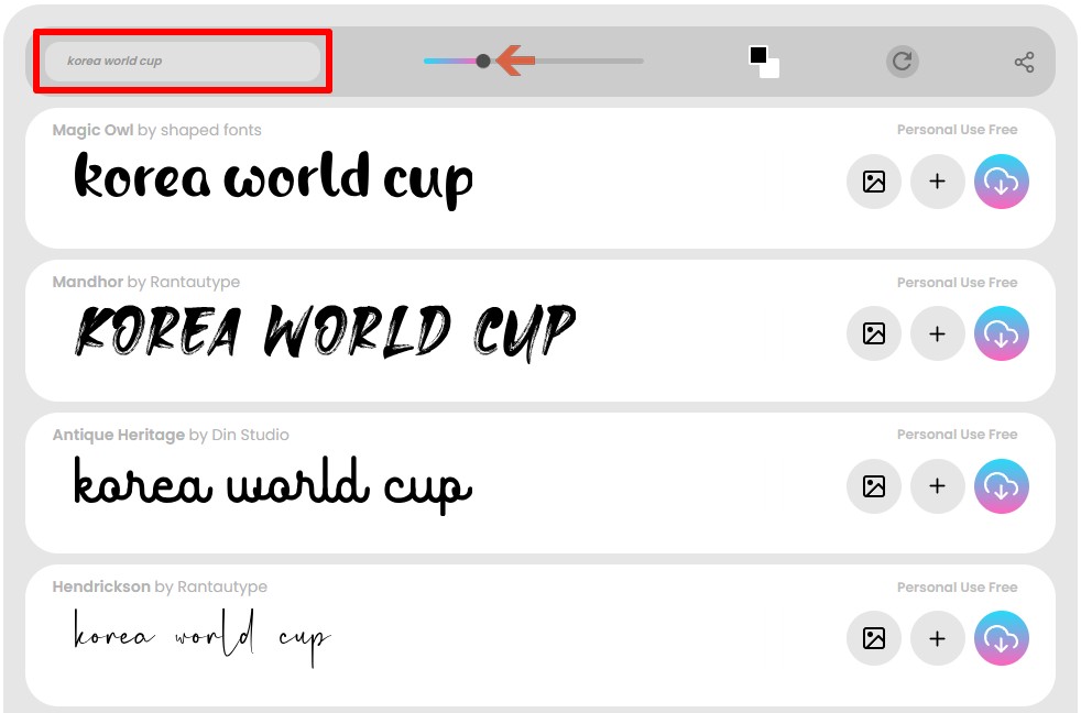 특히 원하는 문구를 타이핑하고 아래 폰트를 클릭하면 해당 폰트로 미리보기가 가능하기 때문에 편리하게 이용 가능합니다.