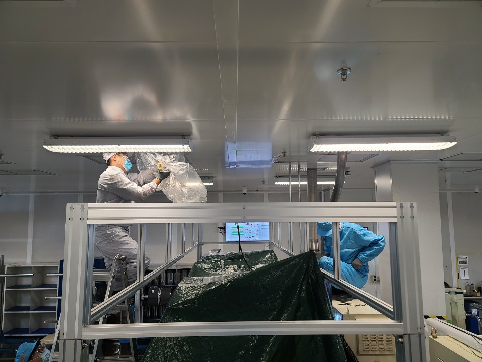 상부에 캡 형식으로 FFU를 추가 설치하는 방식으로 기계장비 옆 바닥에서 프레임 제작 조립 후 장비 상부 쪽에 타공 하는 방식으로 진행하였습니다.