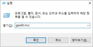 1. 윈도우 단축키+R 버튼을 눌러 실행 메뉴에서 gpedit.msc 입력 후 확인 버튼을 클릭해 줍니다.