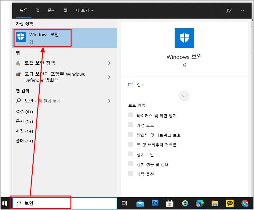 1. 윈도우 시작버튼 ▶ 설정(톱니바퀴) 버튼을 눌러 [업데이트 및 보안] 메뉴를 클릭한 후 좌측에 [Windows 보안] 메뉴를 클릭 하시거나 윈도우 좌측 하단에 검색 텍스트박스에 "보안" 이라고 검색한 후 위에 [Windows 보안 앱]을 실행해 줍니다.