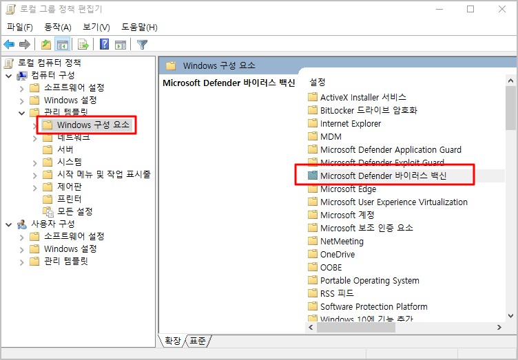 2. 실행된 로컬 그룹 정책 편집기에서 관리 템플릿 ▶ Windows 구성 요소 ▶ Microsoft Defender 바이러스 백신 메뉴를 더블 클릭 해 줍니다.