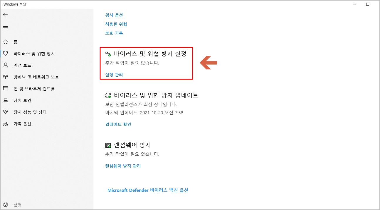 3. 스크롤을 아래로 내려서 [바이러스 및 위협 방지 설정] 메뉴 바로 밑에 [설정관리]를 클릭해 줍니다.