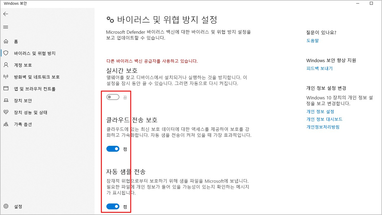 4. 필요에 따라 [실시간 보호] 및 [클라우드 전송 보호], [자동 샘플 전송] 설정을 켬에서 끔으로 변경합니다.