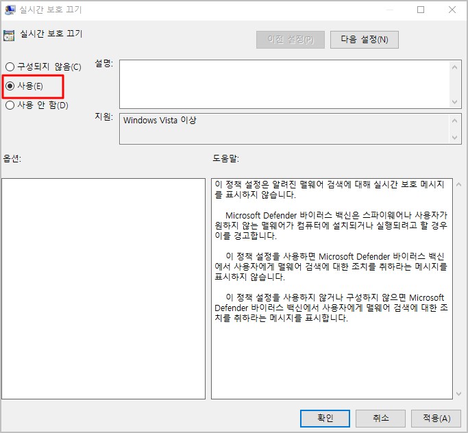4. 실시간 보호 끄기를 더블 클릭하면 실시간 보호 끄기 메뉴가 팝업창으로 뜨게 되며 좌측에 실시간 보호 끄기 사용(E) 으로 체크하면 영구적으로 Windows defender 바이러스 백신이 작동되지 않습니다.