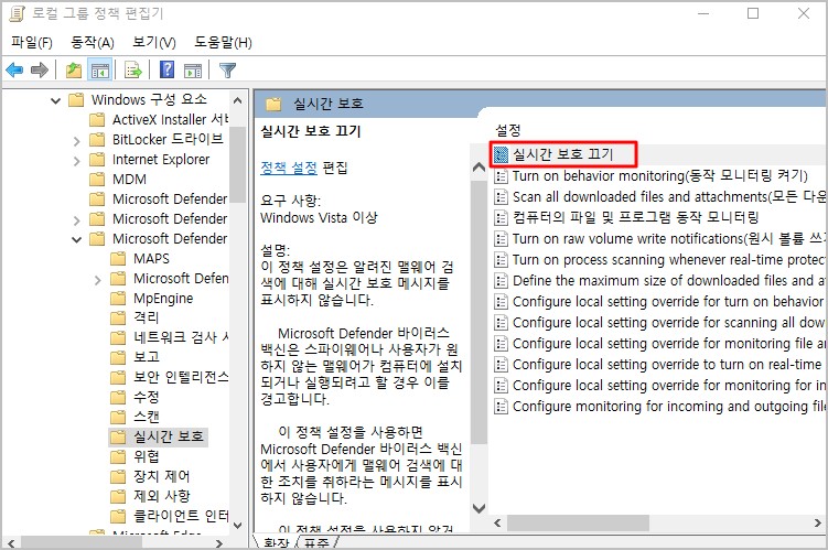 3. 윈도우10 Windows Defender 바이러스 백신 - [실시간 보호 메뉴]를 더블 클릭 해 줍니다.