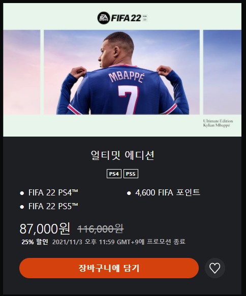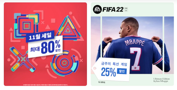 이번 할인은 국가 별로 구성이 조금씩 다른데, 자세한 내용은 PS 스토어에서 확인할 수 았습니다. 한편, 11월 세일과는 별개로 금주의 특선 게임으로 지정된 피파 22의 25% 할인 판매도 진행 중이다. 피파 22 할인은 11월 3일까지 진행된다고 하니 서두르시기 바랍니다.