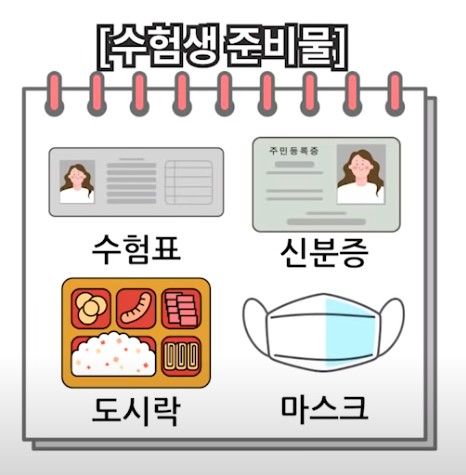 수험생의 경우, 시험 당일 수험표, 신분증, 필기도구, 도시락, 마스크는 반드시 챙기시기 바라며,