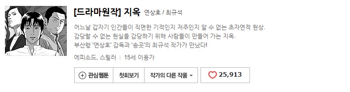 2003년 연재된 웹툰 <지옥>을 기반으로 탄생된 작품인데 총 57화로 구성된 본 작품은 지옥의 사자들로 하여금 지옥행을 선고받는 초자연적인 현상이라는 독특한 세계관으로 관심이 집중됩니다.