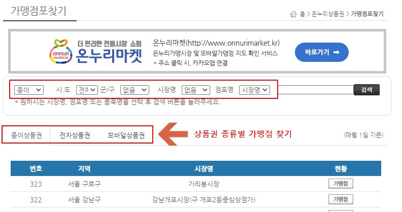 또한, 지류 상품권과 같이 전통시장 통통 홈페이지에서 가맹점포 찾기를 선택하여 사용처를 쉽게 확인할 수 있습니다.