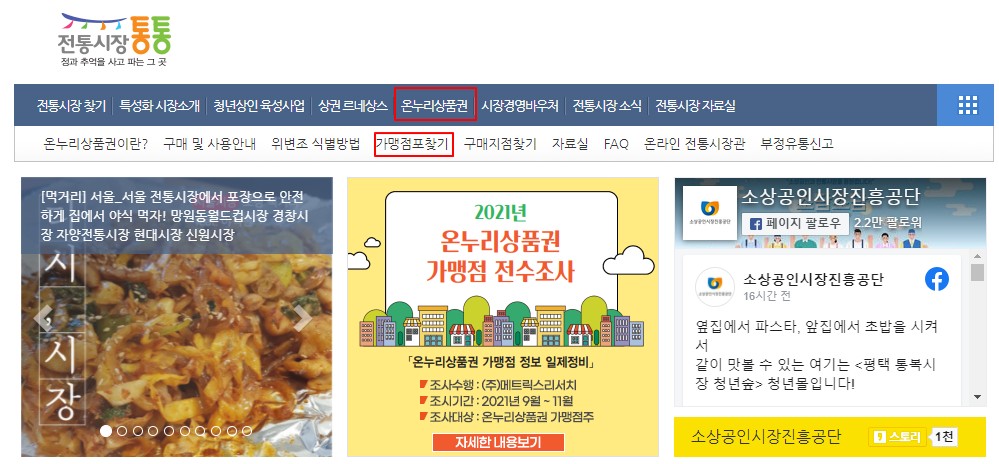 이외에 온누리상품권 사용처를 확인하기 위해서는 소상공인 시장 진흥공단에서 운영하는 <전통시장 통통 홈페이지>에 접속해서 확인할 수 있습니다.