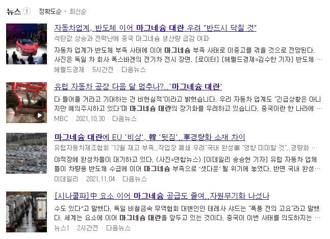 마그네슘 가격은 올해초부터 꾸준히 오르고 있는데 1월 기준 1톤에 305만원에 거래되던 마그네슘은 9월 기준 1,310만원으로 5배가량 상승한 상태고, 중국발 수입 차질이 장기화되면 상승폭은 더욱 확대될 것으로 예상됩니다. 이런 상황이 계속된다면 요소수에 이어 마그네슘의 가격 폭등과 품귀현상도 나타날 것으로 예상됩니다.