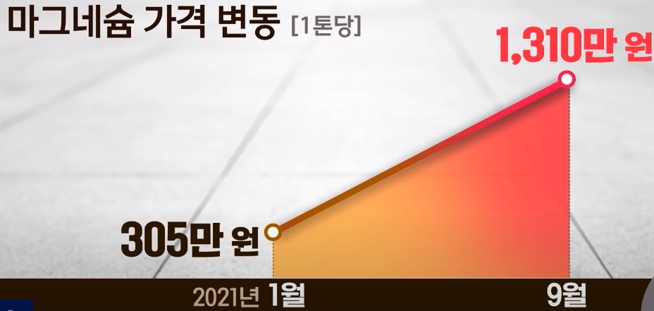 마그네슘 가격은 올해초부터 꾸준히 오르고 있는데 1월 기준 1톤에 305만원에 거래되던 마그네슘은 9월 기준 1,310만원으로 5배가량 상승한 상태고, 중국발 수입 차질이 장기화되면 상승폭은 더욱 확대될 것으로 예상됩니다. 이런 상황이 계속된다면 요소수에 이어 마그네슘의 가격 폭등과 품귀현상도 나타날 것으로 예상됩니다.
